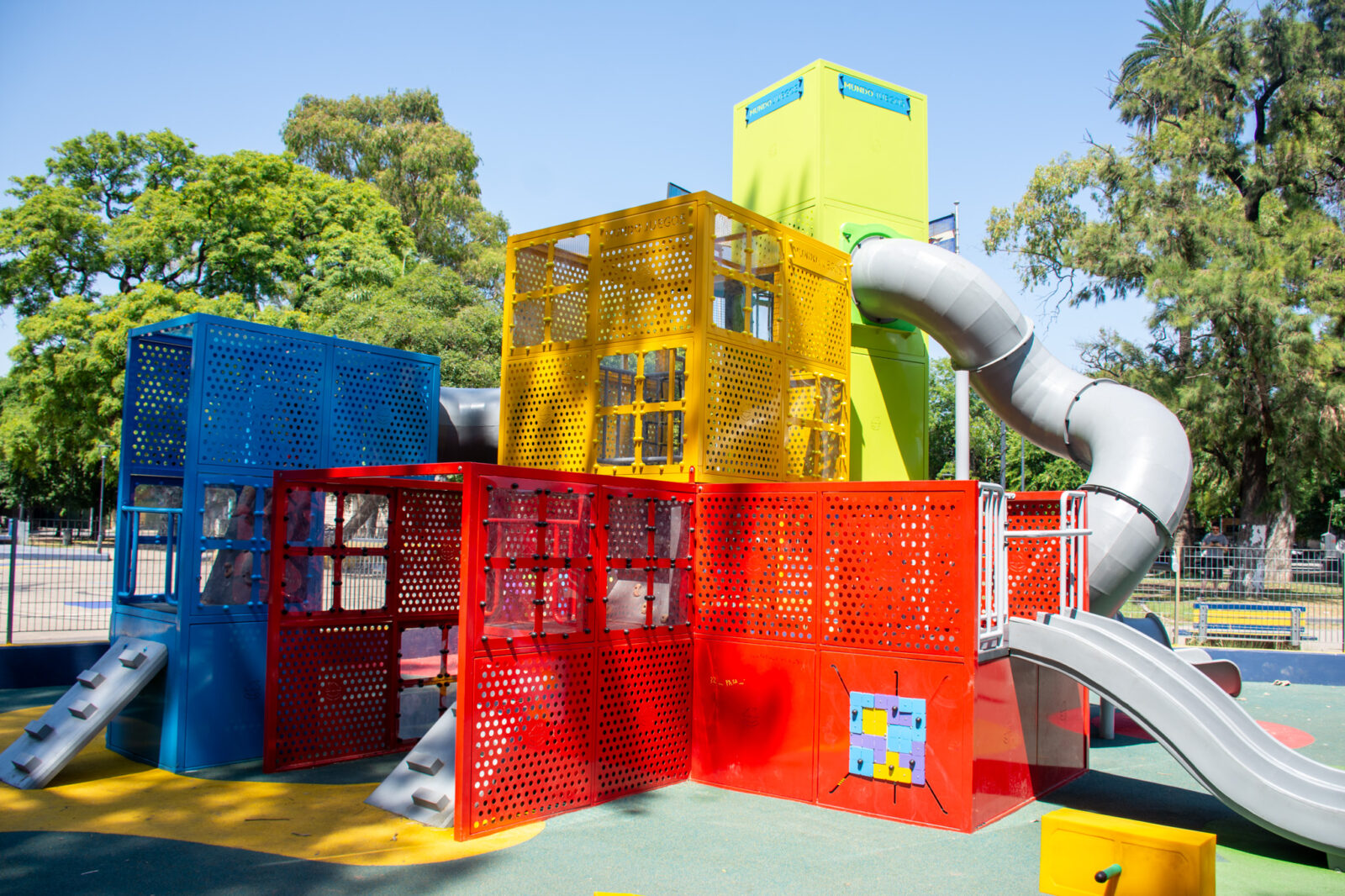 Uno de los ejes centrales fue la renovación del patio de juegos, que adoptó la temática “La Boca” como hilo conductor del diseño. El mangrullo tetris, inspirado en los containers del puerto, junto con hamacas, lomadas, circuitos de equilibrio, calesita y juegos de resortes, dio forma a un espacio lúdico colorido y representativo. Se sumó, además, un sector de acompañantes con mesas, promoviendo la permanencia y el encuentro.